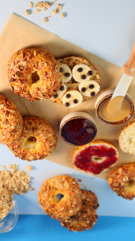 Colocar os bagles num tabuleiro forrado com papel vegetal. Pincelar com o ovo batido e polvilha com o crunchy muesli de aveia e mel e as sementes de papoila.