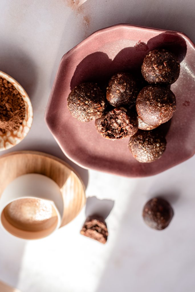 Juntar a manteiga de amendoim Salutem, o xarope de agave e o extrato de baunilha e o cacau em pó e triturar novamente;