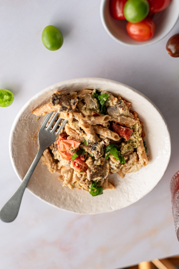 Adicionar a massa e mexer novamente. Antes de servir adicionar folhas de manjericão picado.