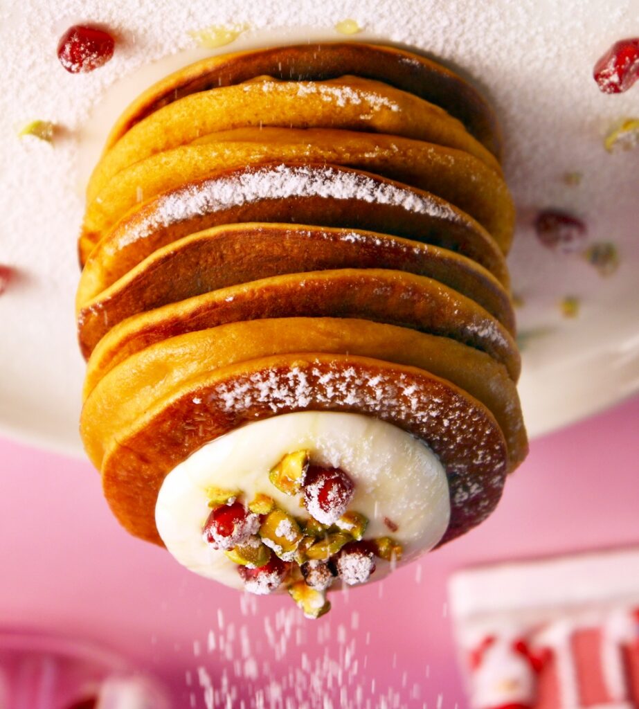 Cozinhar até surgirem bolhinhas à superfície, virar e deixar dourar do outro lado. Num prato montar as panquecas e decorar com um pouco de iogurte grego natural, os pistácios, as sementes de romã e açúcar em pó.