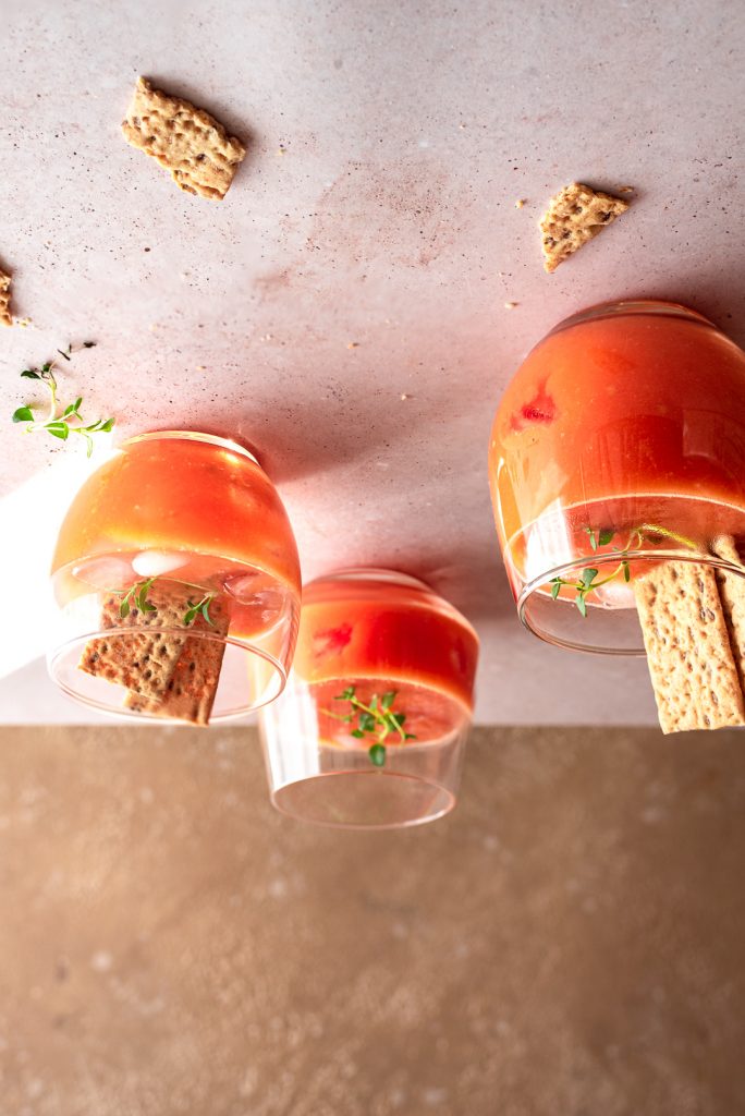 Coloque cubos de gelo por 3 copos e distribua a sopa de tomate. Decore com tomilho e sirva com os crispy bread de sésamo.